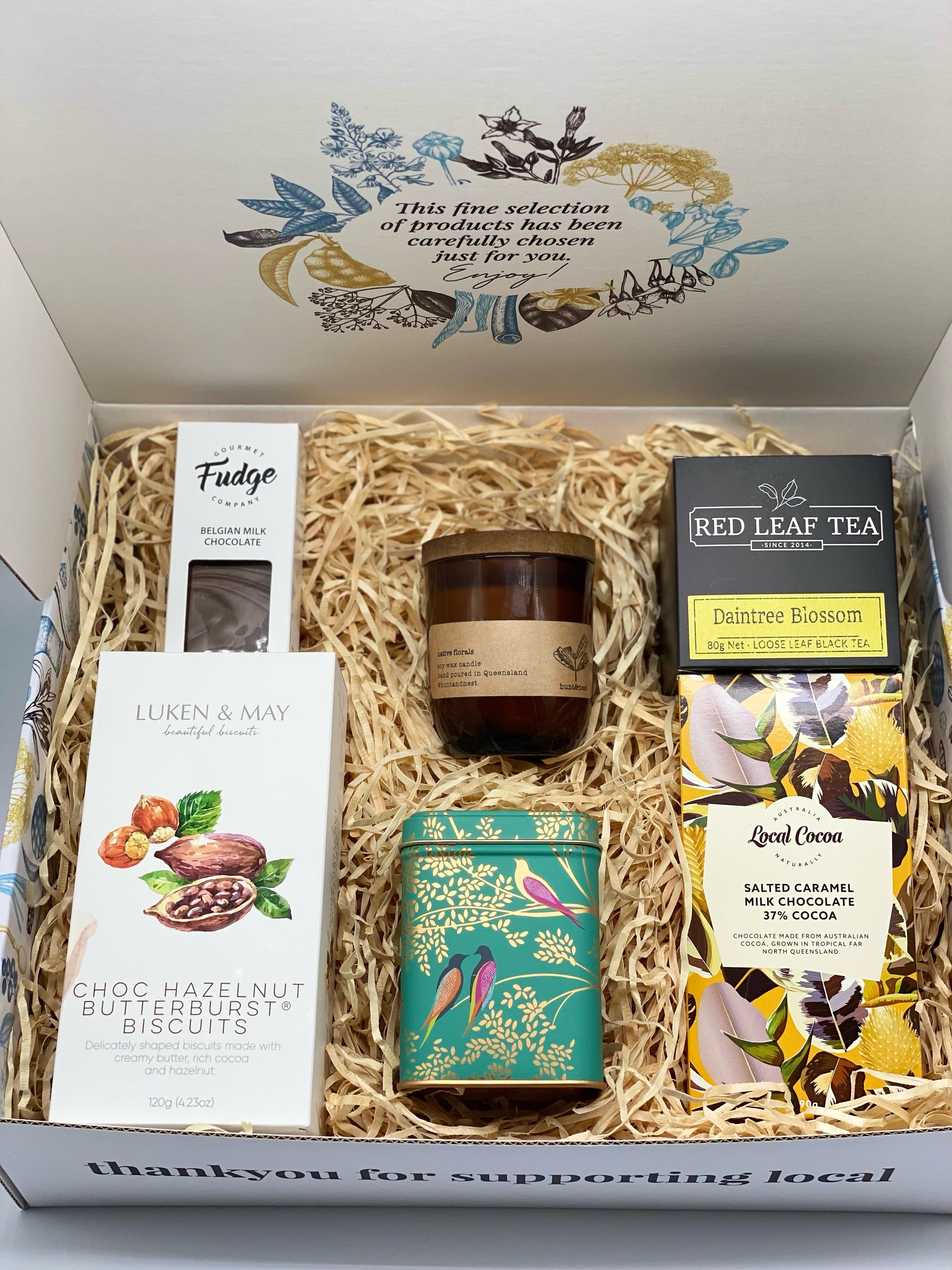 Products featured in this hamper are from our favourite brands such as Local Cocao Chocolate, Daintree rainforest tea, delicious choc hazelnut butterburst biscuits from Byron Bay, handmade gourmet fudge from the Sunshine Coast and the most incredible native floral scented candle from Hunt & Nest on the Gold Coast.